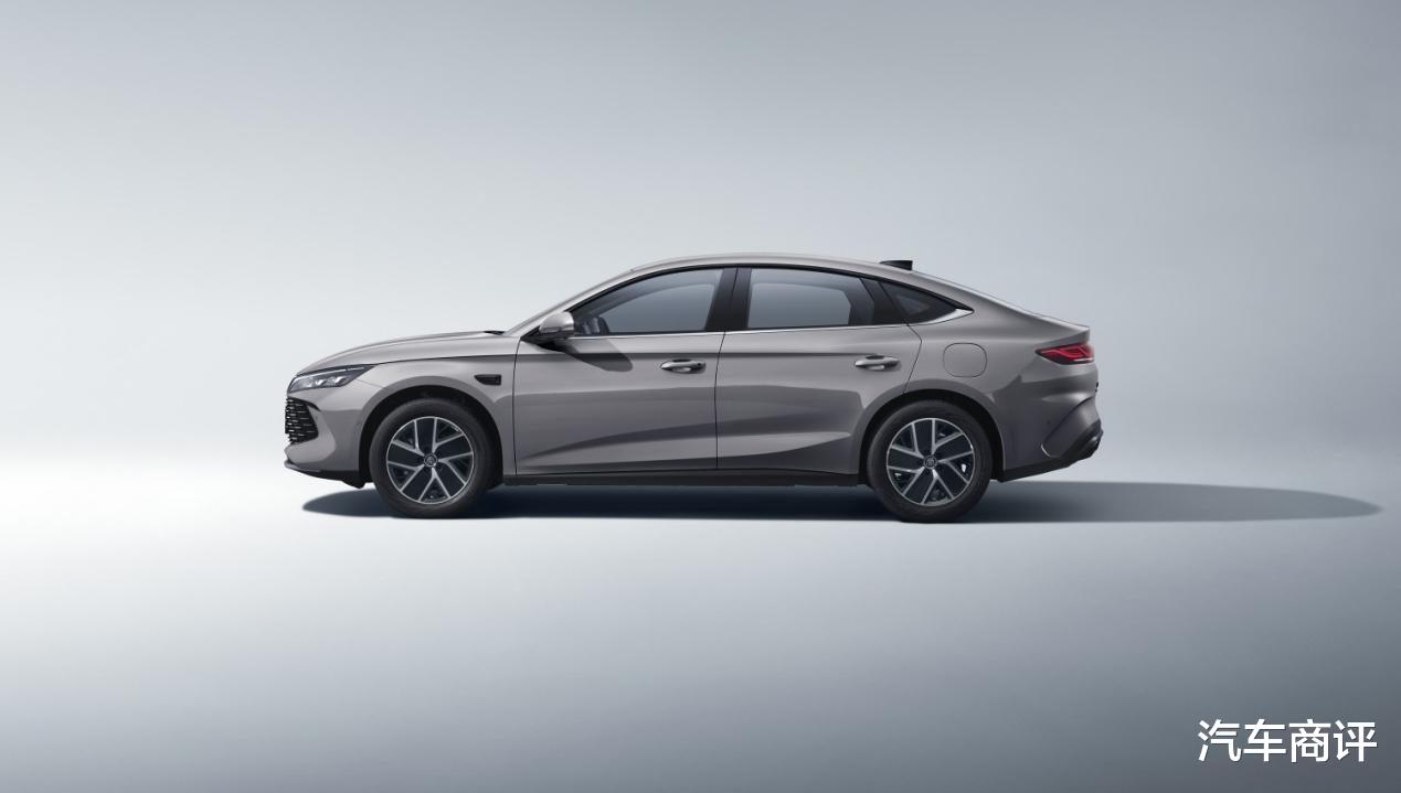 从侧面看,新车车身显得修长优雅、轮廓流畅,高挑的肩线自前车盖向后延伸,与一条自前翼子板下方向后延伸的腰线共同刻画出丰富的视觉效果,搭配大溜背,进一步凸显了整车的轿跑风味,而五幅式轮毂与整车低趴姿态的组合,也很好的融入了整车的运动氛围感。